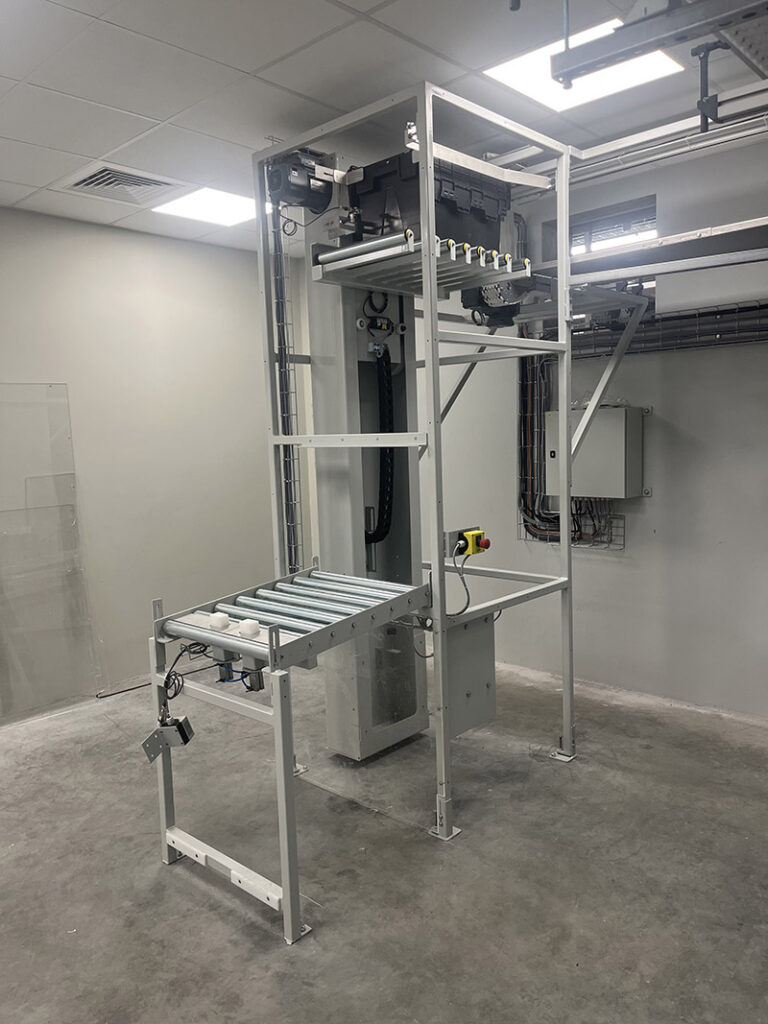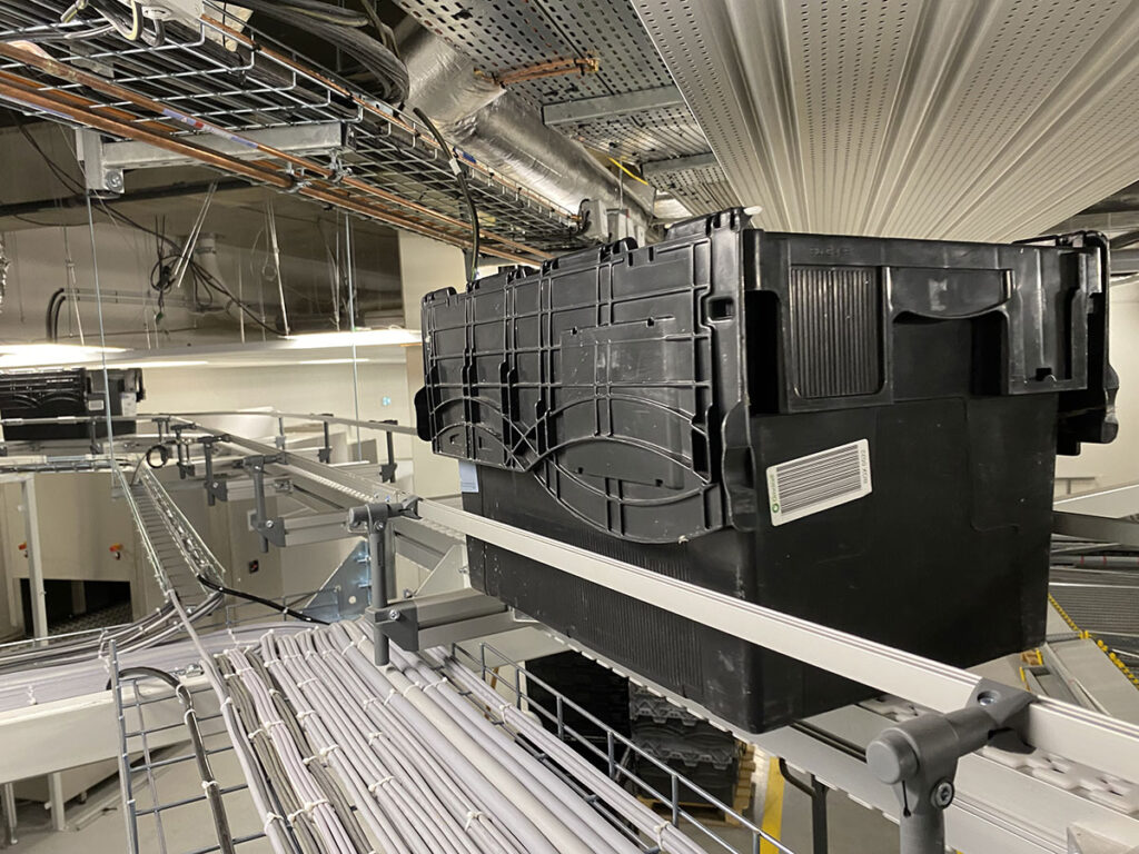 À chaque point de préparation, un descenseur vertical de caisse est intégré à la ligne de convoyage aérienne, plaçant les caisses à une hauteur ergonomique idéale pour les opérateurs. Cette approche permet de réduire considérablement les risques de troubles musculosquelettiques (TMS), tout en facilitant le travail au quotidien, notamment dans les zones robotisées et les magasins automatisés.