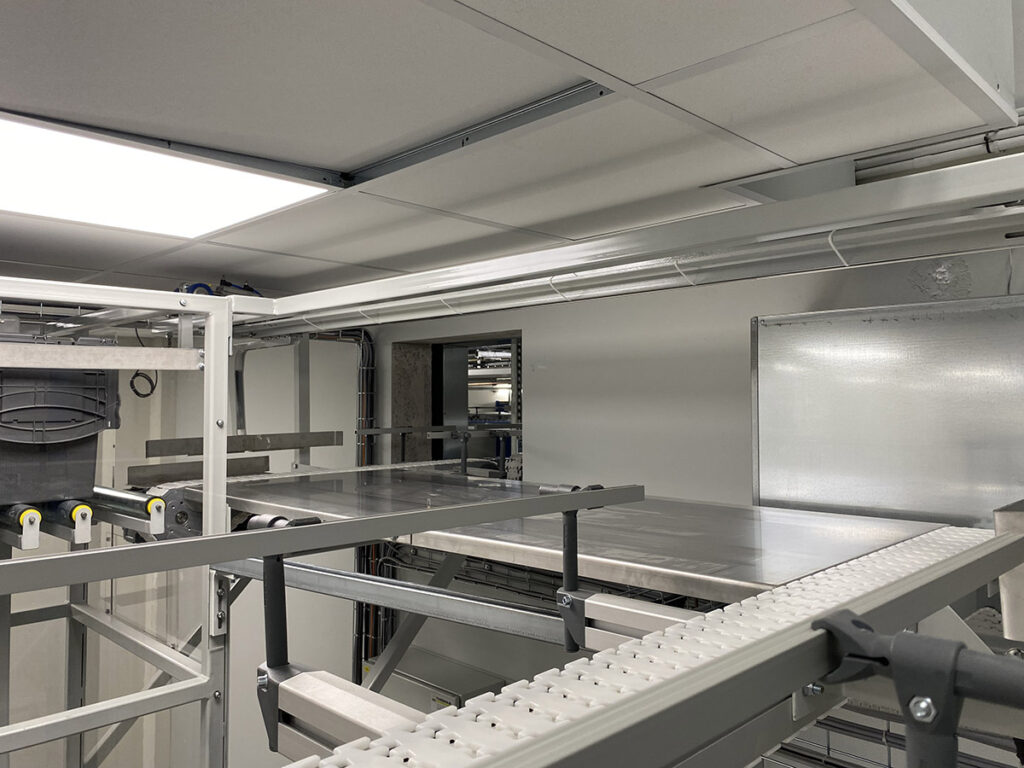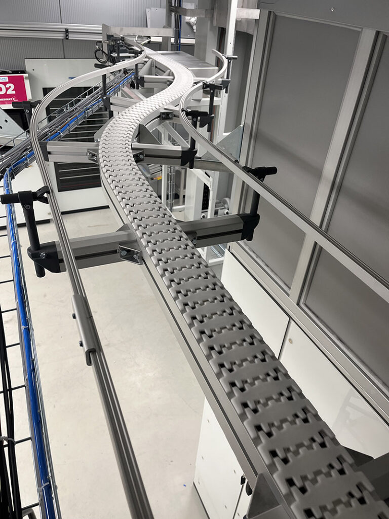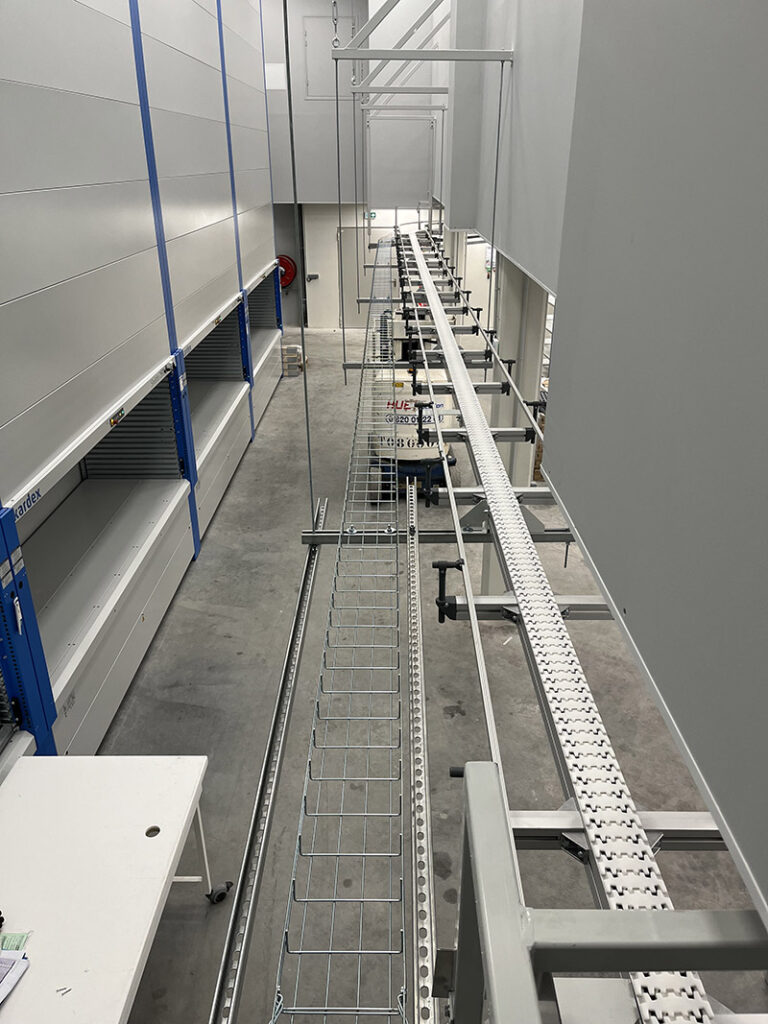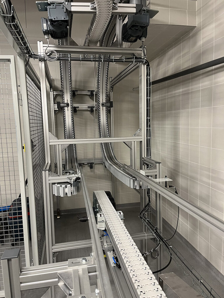 Constituée de convoyeurs à chaînes modulaires, la ligne s’adapte parfaitement aux contours architecturaux du bâtiment. En cas de panne, un mode dégradé assure la continuité du flux logistique, régulant automatiquement les flux et évitant les surcharges à chaque point de préparation. Pilotée depuis une armoire centrale avec un écran IHM, la ligne respecte les plus strictes normes de sécurité et d’hygiène, cruciales dans un environnement pharmaceutique.