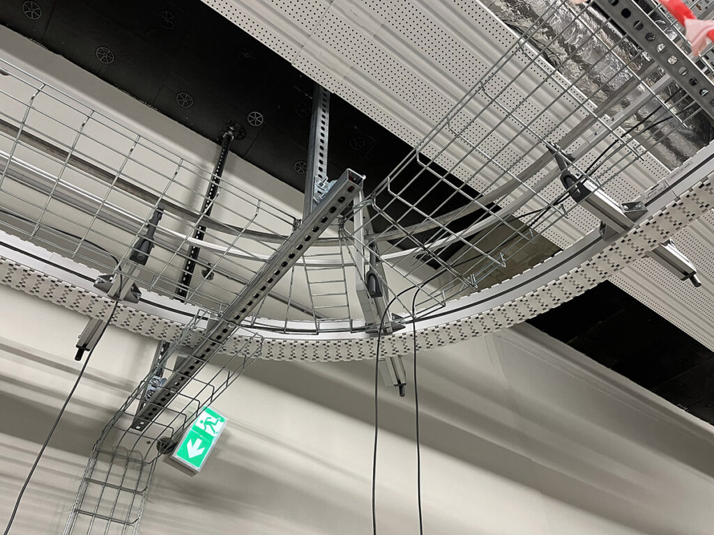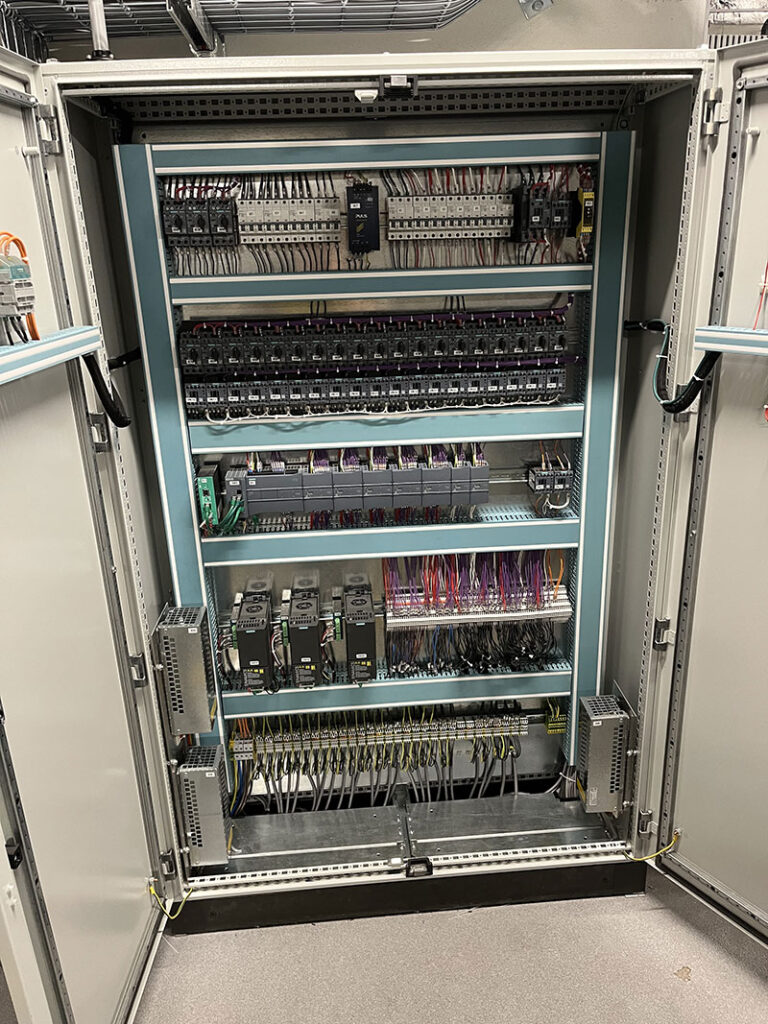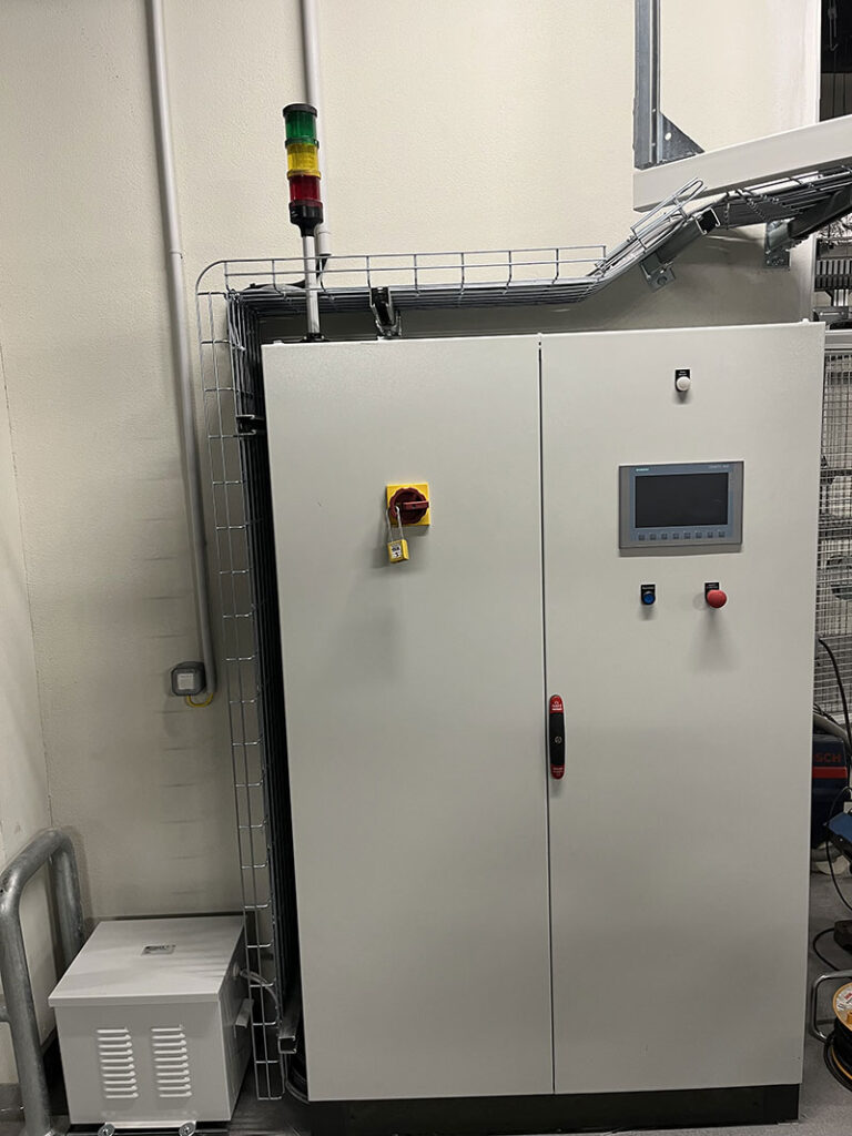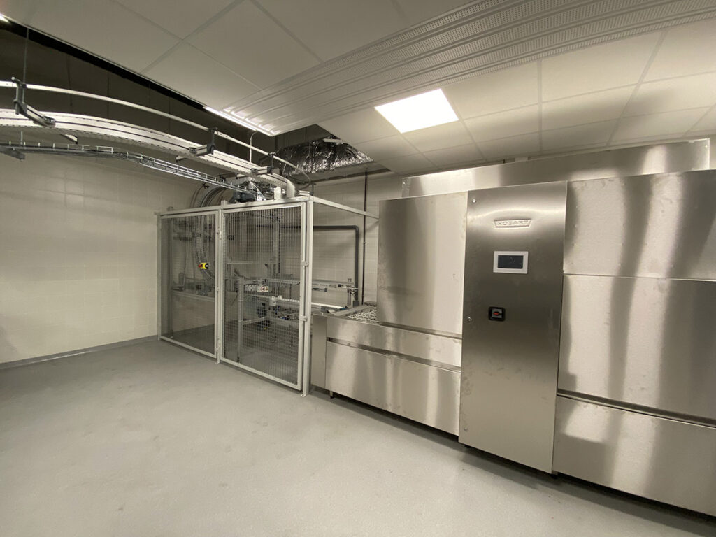 Constituée de convoyeurs à chaînes modulaires, la ligne s’adapte parfaitement aux contours architecturaux du bâtiment. En cas de panne, un mode dégradé assure la continuité du flux logistique, régulant automatiquement les flux et évitant les surcharges à chaque point de préparation. Pilotée depuis une armoire centrale avec un écran IHM, la ligne respecte les plus strictes normes de sécurité et d’hygiène, cruciales dans un environnement pharmaceutique.